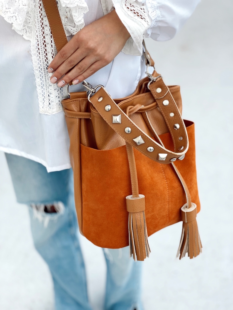 En cuero vacuno graneado con bolsillo delantero al corte en gamuza a tono