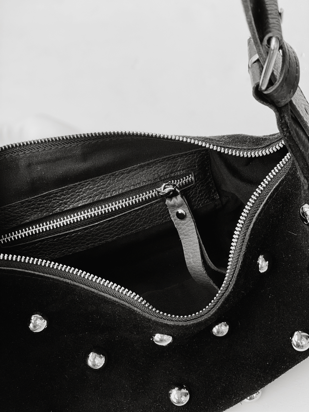 Bandolera al hombro confeccionada en gamuza con apliques en baño niquel.