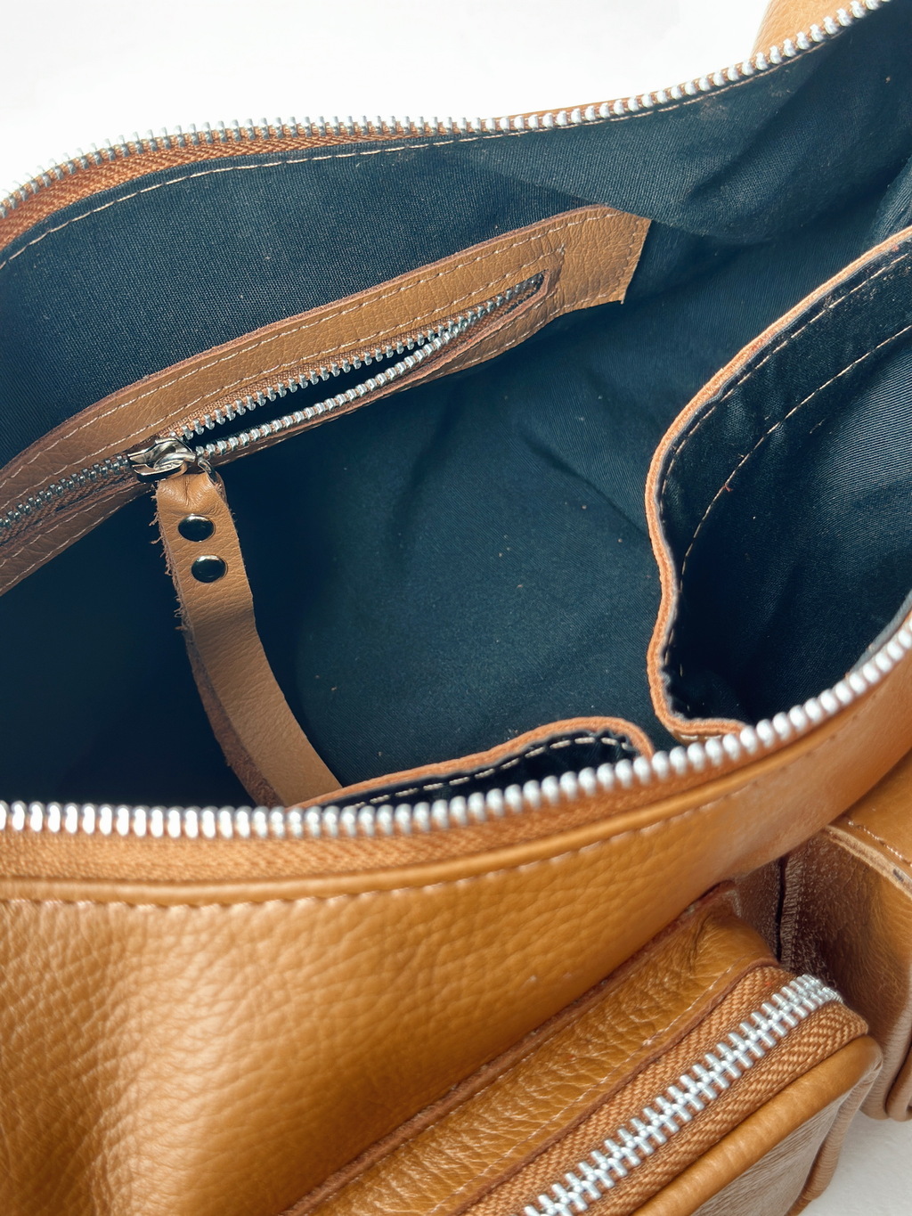 Tiene 2 bolsillos externos en el delantero: uno con cierre y otro plaqué con solapa (y broche iman)